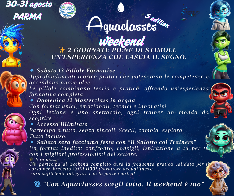 Ti aspetta un percorso unico, guidato da un team straordinario di Emotion-Trainer. Ogni lezione sarà un vero e proprio viaggio emotivo, ispirato al mondo delle emozioni: preparati a viverle tutte… e a portarle con te, in vasca e nella vita!