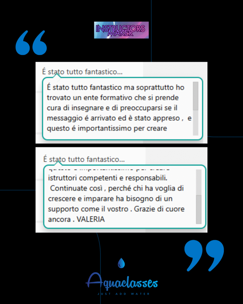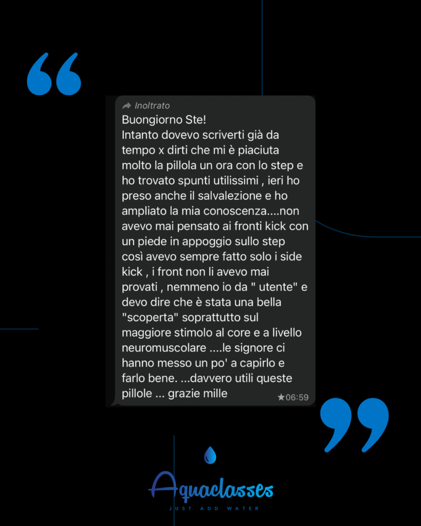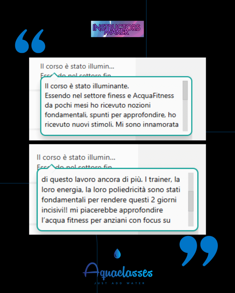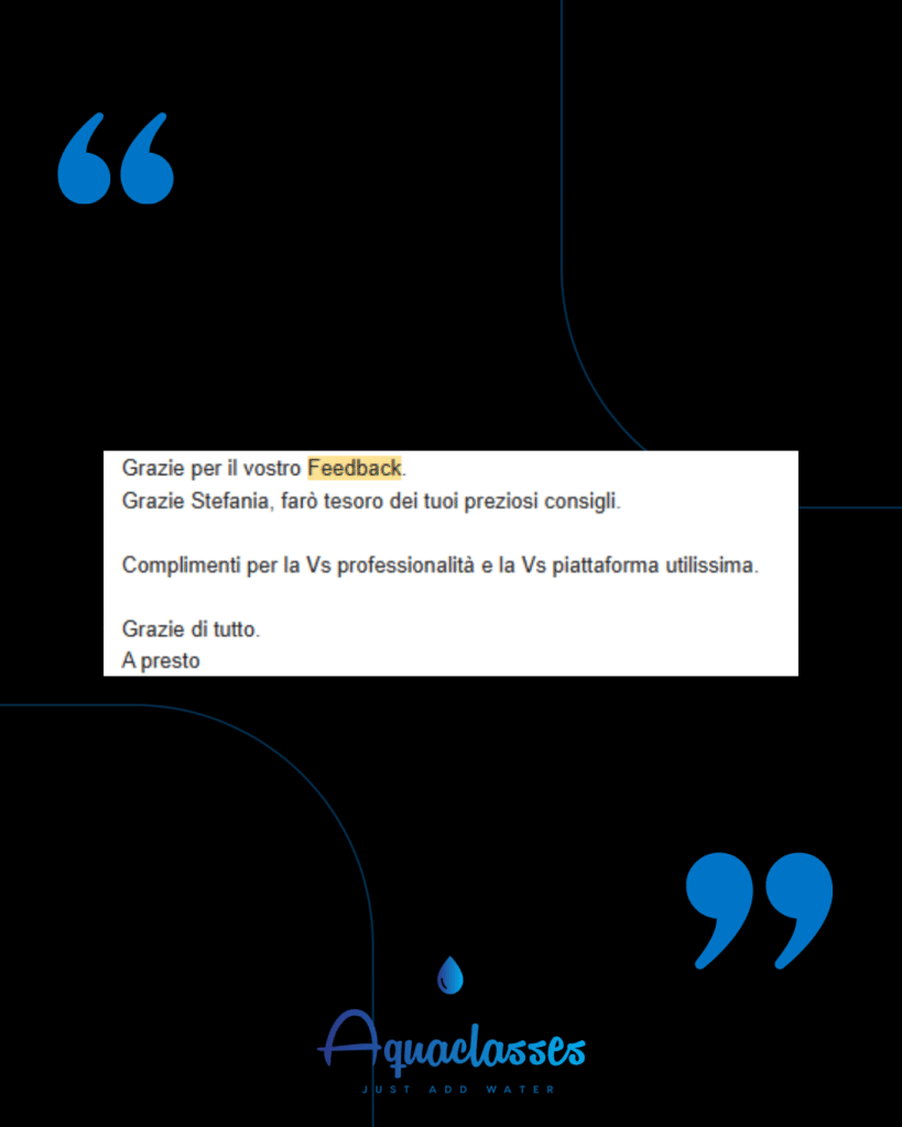 Le testimonianze di chi ha provato Aquaclasses sono la nostra prova più autentica. Persone reali e strutture che grazie alla nostra piattaforma di video on-demand hanno scoperto una nuova visione del fitness acquatico.