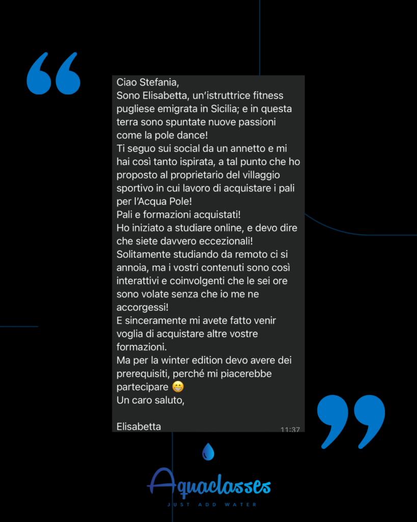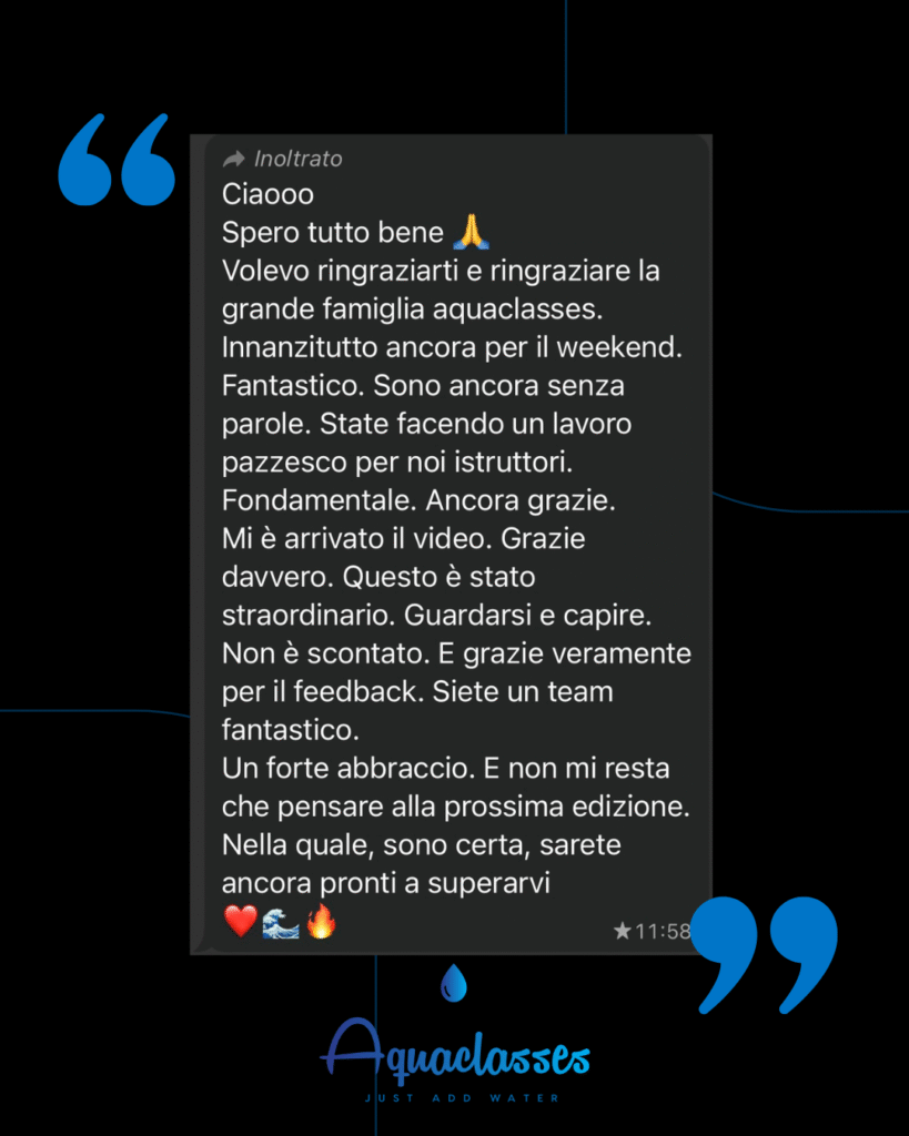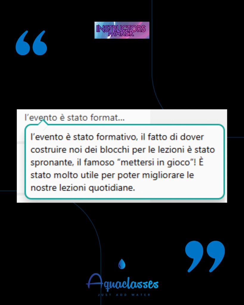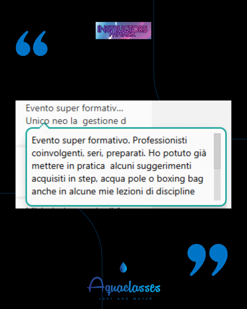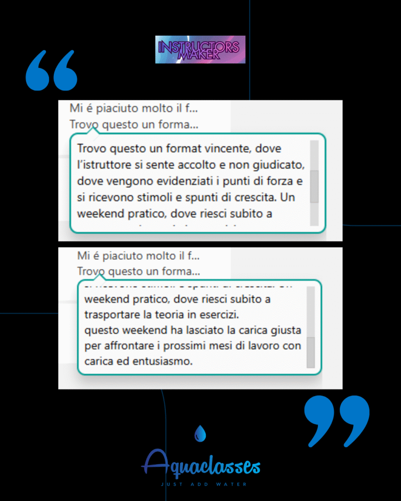 Le testimonianze di chi ha provato Aquaclasses sono la nostra prova più autentica. Persone reali e strutture che grazie alla nostra piattaforma di video on-demand hanno scoperto una nuova visione del fitness acquatico.